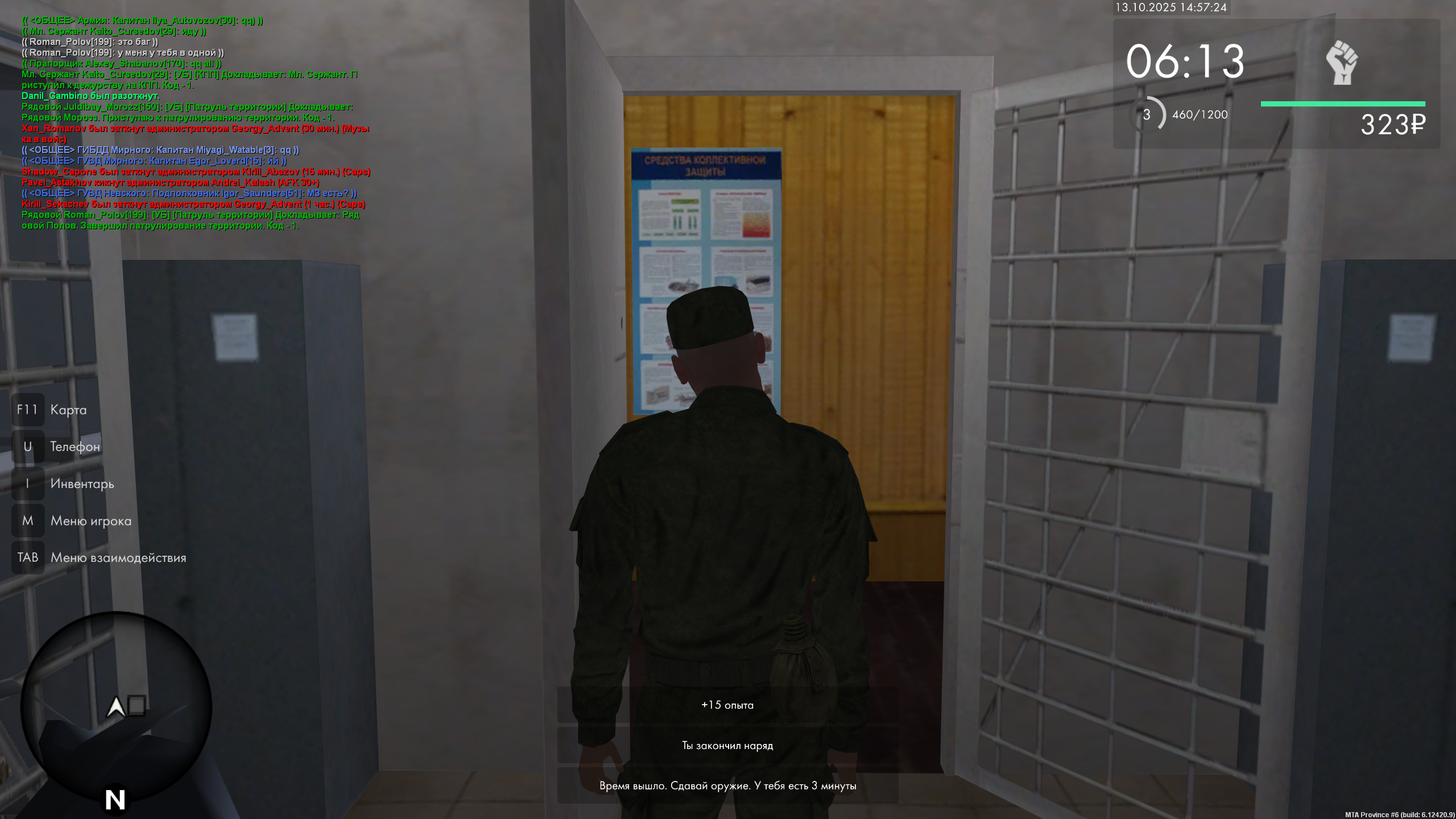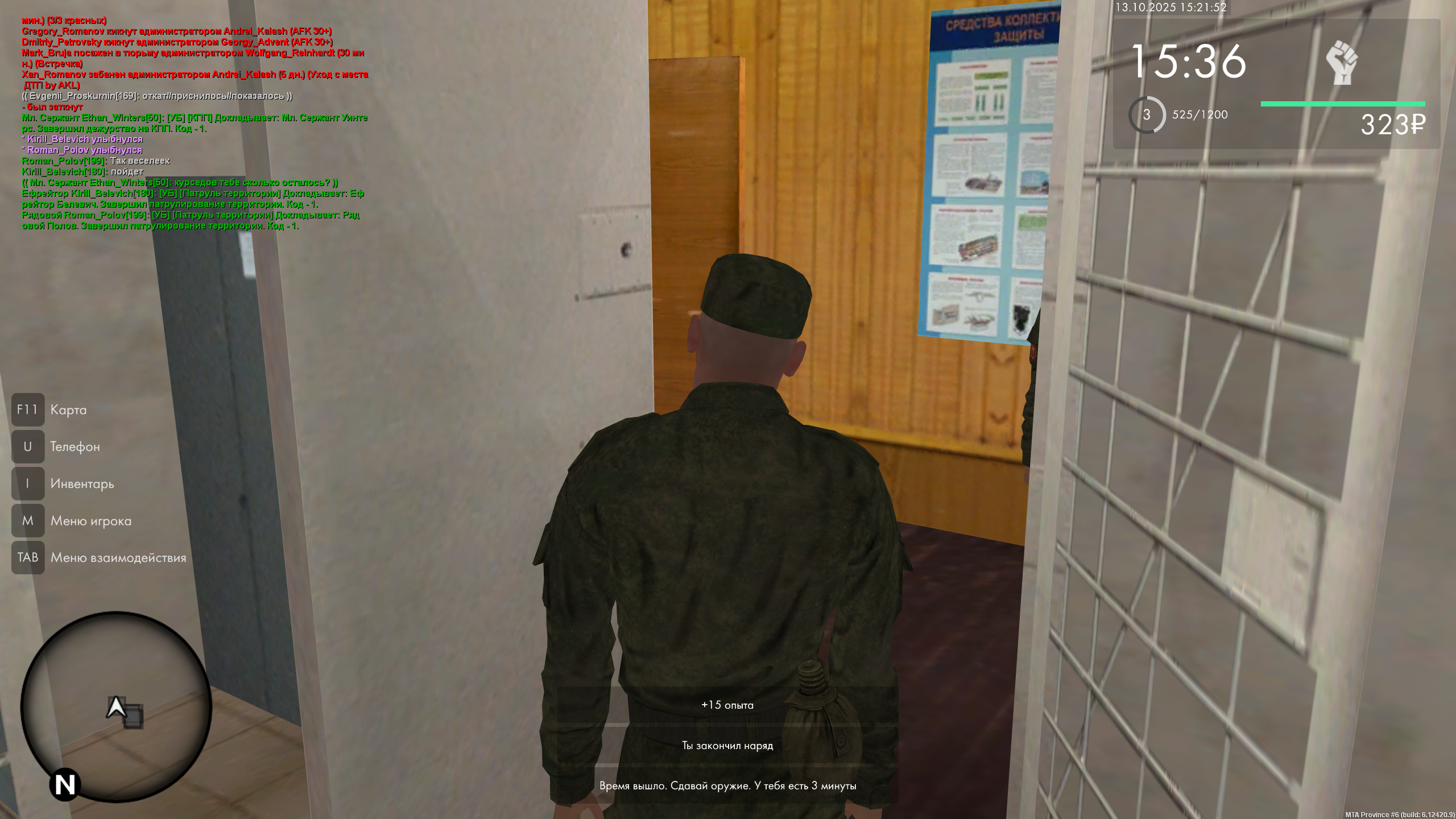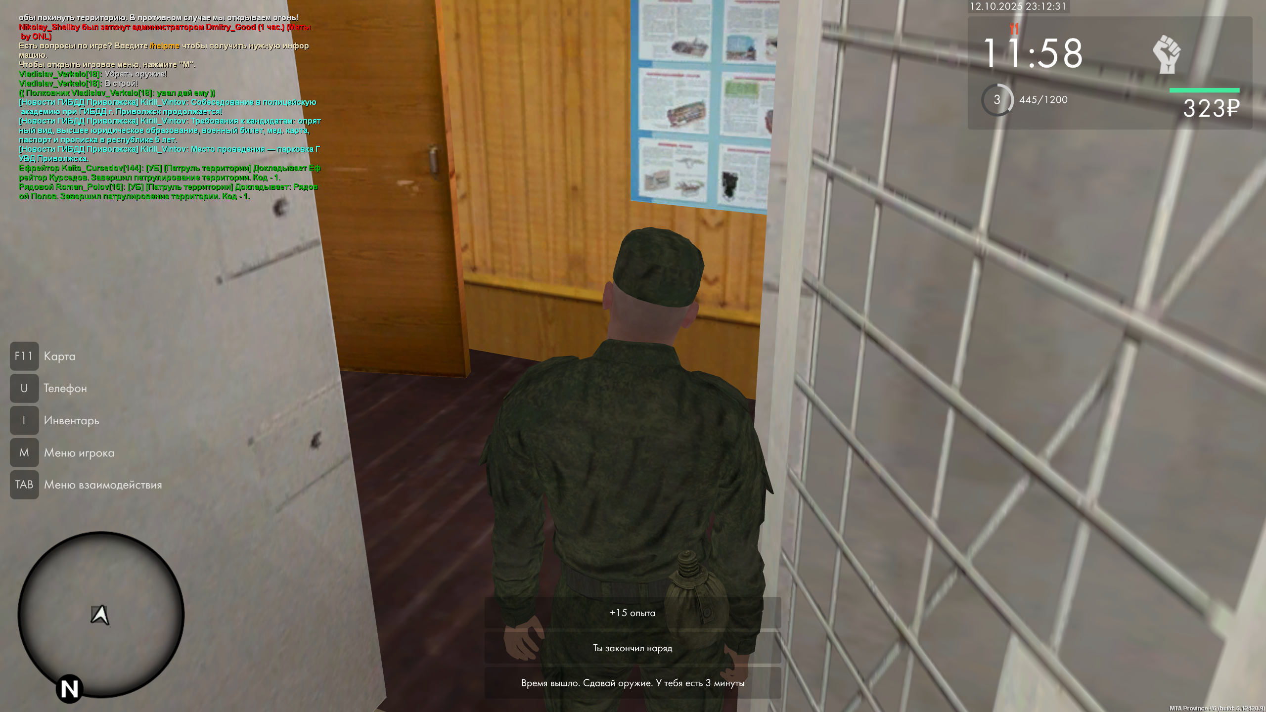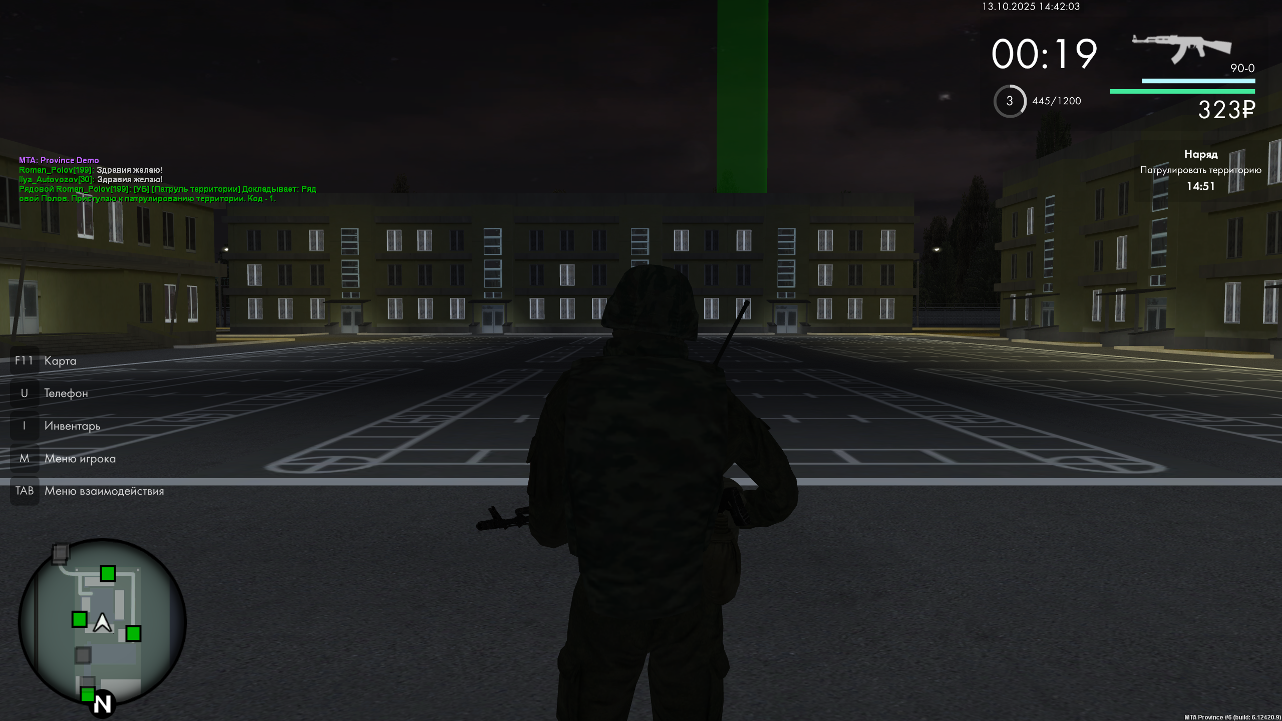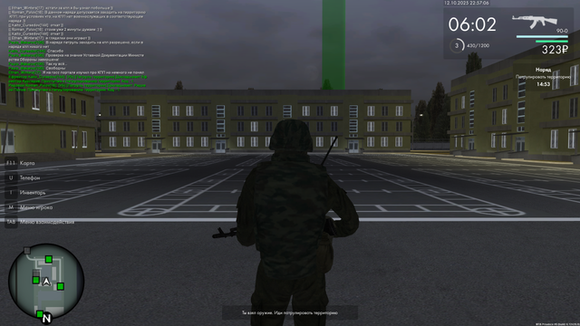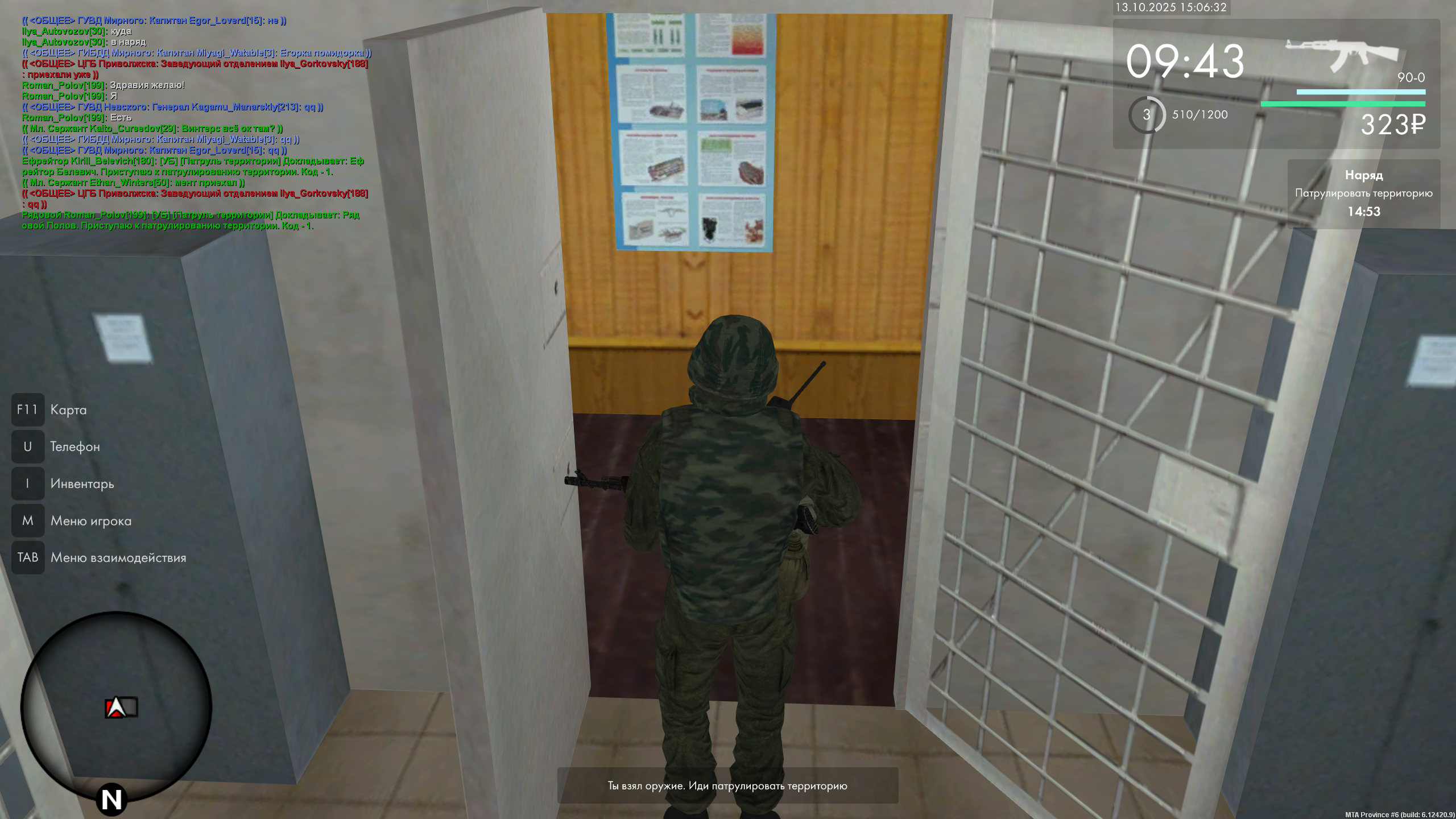 /r [УБ] [Патруль территории] Докладывает: Звание Фамилия. Приступаю к патрулированию территории. Код - 1.