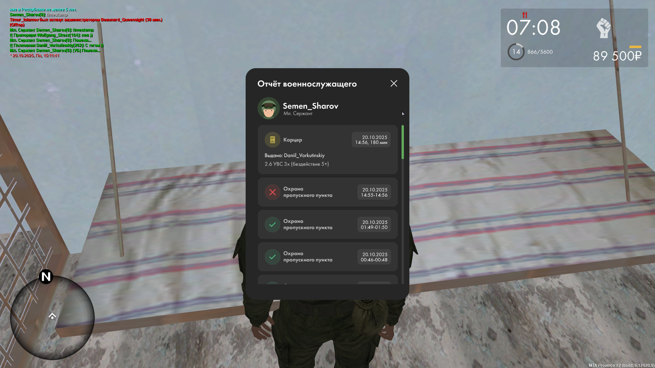Sharik774 0 · ID: #1 Опубликовано 20 октября 1. Ваш никнейм: Semen_Sharov 2. Никнейм сотрудника: Daniil_Vorkutinskiy 3. Скриншот/видео от любого лица: https://i.postimg.cc/wxbgDhP9/mta-screen-2025-10-20-17-11-48.png 4. Суть жалобы: Сотрудник Войнской части выдал мне карцер по причине 2.6 Увс (бездействие 5+) когда я стоял на кпп, прошу доказательство где я нарушил Поделиться сообщением Ссылка на сообщение