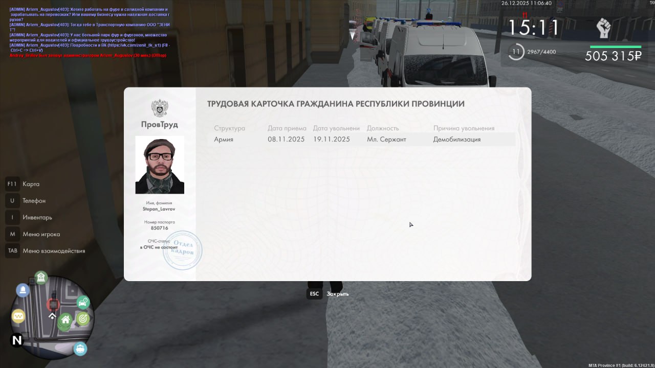 8. Немного о себе:  Адекватный,Трудолюбивый работал в армии в РЖД на Провинции с 25 (это новый аккаунт, так что прошу СА рассмотреть возможность прохождения этим аккаунтом трёхмесячного порога отыгрыша в порядке исключения 2 месяца аккаунту)