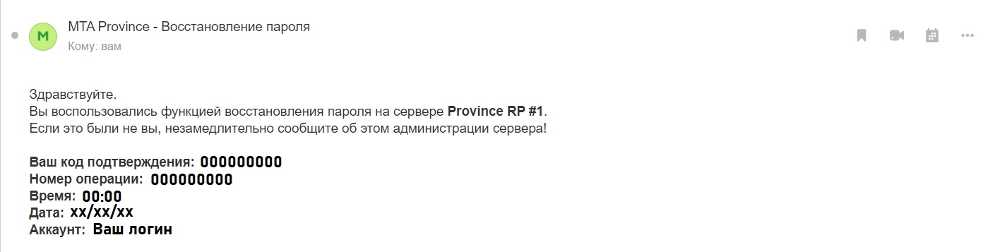 Emily_Hale 1098 · ID: #1 Опубликовано 18 мая, 2021 Что делать, если забыл пароль от аккаунта? 1. Подключитесь к нужному серверу. Снизу есть кнопка "Восстановить". Спойлер 2. Введите свой регистрационный логин, по которому вы входите в игру. Спойлер 3. Если все прошло успешно, то откроется такое окно. Спойлер 4. На почту вам придет письмо, где будет указан код, который нужно ввести в игре в пункт "код подтверждения". Введите новый пароль и нажимайте "Подтвердить". Спойлер Если все пройдет успешно, ваш пароль изменится и вы автоматически зайдете в игру. Поделиться сообщением Ссылка на сообщение