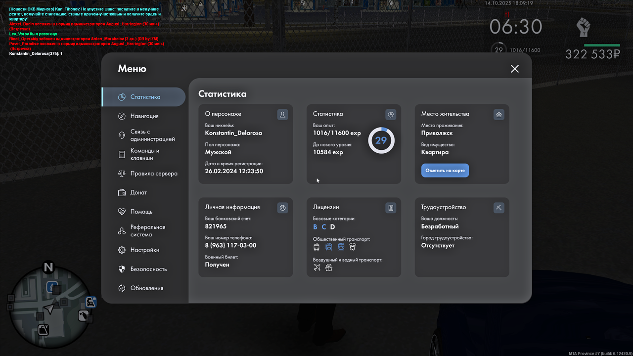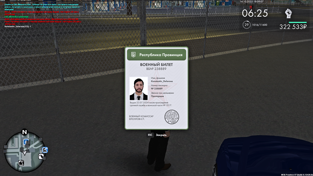 Dmitriy321123 0 · ID: #413 Опубликовано Вторник в 15:13 Начальнику Главного управления по обеспечению безопасности дорожного движения РП по городу Приволжск Генерал-Лейтенанту полиции Шульгину Артёму Сергеевичу От гражданина Республики Провинции Делароса Константин Иванович Заявление на трудоустройство Я, Делароса Константин Иванович, прошу рассмотреть свою кандидатуру на вступление в центр профессиональной подготовки при государственной инспекции безопасности дорожного движения города Приволжск. Согласно моему желанию, я хотел бы рассмотреть возможность служить в следующем звании: - рядовой полиции Сведения, прилагаемые к данному заявлению, включают в себя: Ксерокопия паспорта (ссылка на скриншот /pass): https://i.postimg.cc/7Zj6G1Qm/MTA-San-Andreas-14-10-2025-22-08-39.png Ксерокопия медицинской карты (ссылка на скриншот /medcard):https://i.postimg.cc/DzVvyvSn/MTA-San-Andreas-14-10-2025-22-08-54.png Ксерокопия военного билета (ссылка на скриншот /vb):https://i.postimg.cc/6q1wswkc/MTA-Province-Opera-14-10-2025-22-09.png Ксерокопия статистики (ссылка на скриншот /stats):https://i.postimg.cc/zX650zS0/MTA-Province-Opera-14-10-2025-22-09.png Имеете ли вы опыт работы в сфере ГИБДД? Нет. Ксерокопия трудовой книжки (ссылка на скриншот /tk), а также иные доказательства работы в ГИБДД (при необходимости): https://i.postimg.cc/63MxRtpR/MTA-Province-Opera-14-10-2025-22-10.png Связь со мной (ссылка на страницу ВКонтакте, личные сообщения разблокированы):https://vk.com/kostal154 Дата составления заявления: 14.10.2025 Подпись гражданина: Константин Поделиться сообщением Ссылка на сообщение Поделиться на другие сайты Поделиться