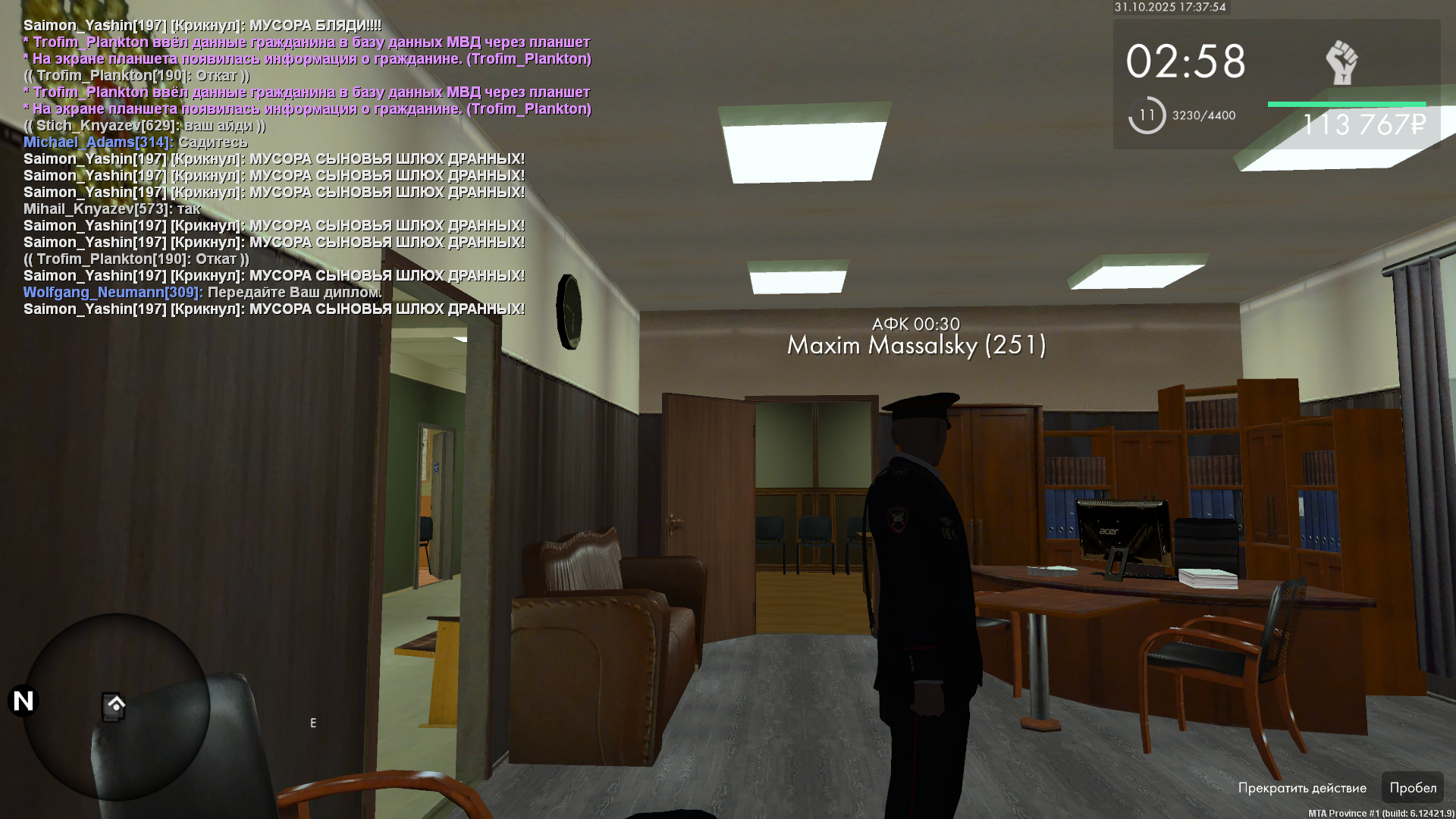 Ivan_Vinston 1 · ID: #4144 Опубликовано 7 часов назад (изменено) 1. Номер жалобы: 5923 2. Ваш никнейм: Ivan_Vinston 3. Ник нарушителя: Saimon_Yashin 4. Описание ситуации: Обычная реакция школьника. на то что посадили в КПЗ, оскает родных. 5. Доказательства (видео с /timestamp или скриншот с /timestamp и/или время над худом): https://storage.yandexcloud.net/fotora.ru/uploads/26e5b757b48b5e75.png Изменено 17 минут назад пользователем Nestor_Rutherford Будет наказан. Поделиться сообщением Ссылка на сообщение Поделиться на другие сайты Поделиться
