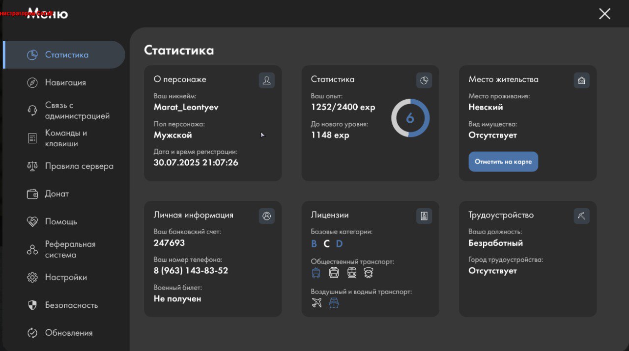 Carcer88 0 · ID: #137 Опубликовано 12 часов назад IC информация: 1. Ваше Имя_Фамилия (никнейм): Marat_Leontyev 2. Ваш возраст: 24 3. Ксерокопия документов (/pass): https://i.supaimg.com/a014911d-b9f3-4847-9967-87d36573f178.jpg 4. Опыт в ОПГ (если имеется): Нету 5. Почему Вы решили вступить именно к нам ? Наслышался от других людей 6. Кто Вас пригласил?: — OOC информация: 1. Ваше имя: Марат 2. Ваш реальный возраст: 17 3. Ссылка на ВК: https://vk.com/carcerogm 4. Скриншот /stats: https://i.supaimg.com/84b49870-cd66-4780-aa40-37f7dc9d0b00.jpg 5. Ваше время относительно МСК: МСК Поделиться сообщением Ссылка на сообщение